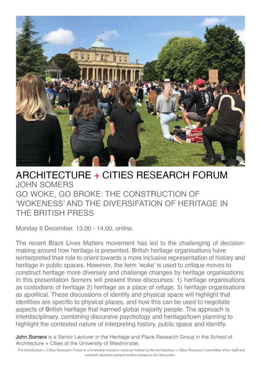 The final A+C research seminar of the year ill take place on Monday 8 December, 13.00 – 14.00 online. John Somers will present a seminar titled Go Woke, Go Broke: the Construction of ‘Wokeness’ and the Diversification of Heritage in the British Press.