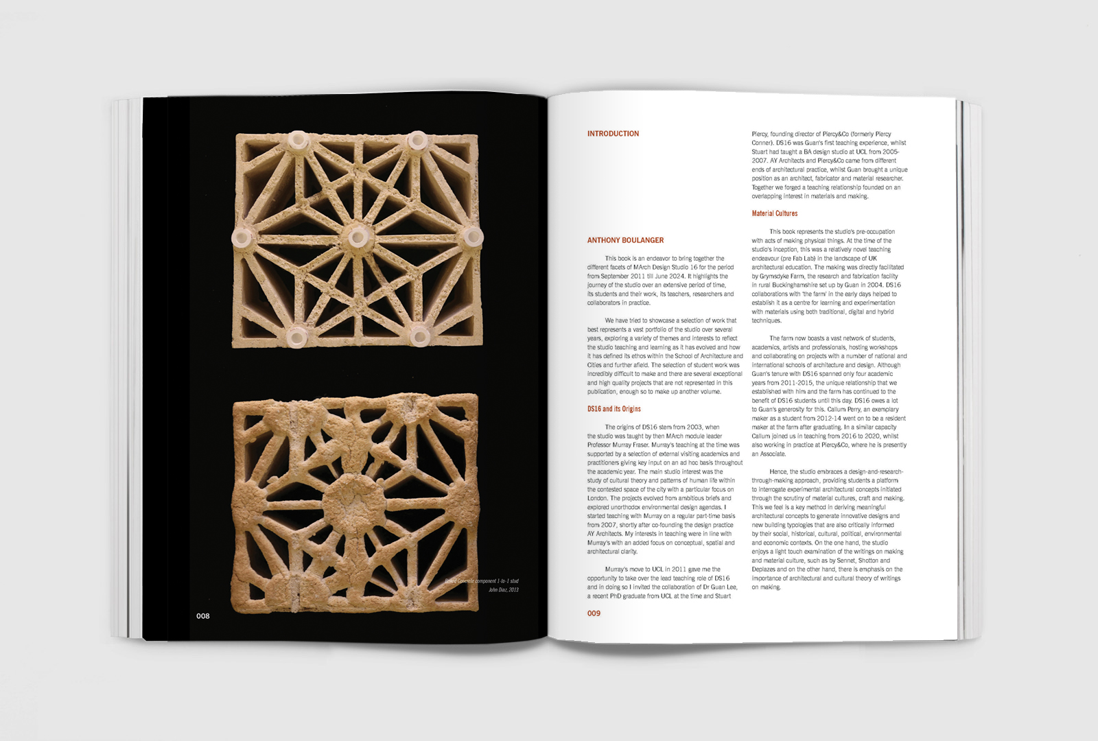 This edition of Studio as Book illustrates the studio teaching, student work, research and knowledge exchange of the Masters in Architectural Design Studio 16 [DS16] spanning an extensive period from 2011 until 2024. During this time the studio has established itself as a platform for students to interrogate experimental architectural concepts initiated by investigations of material cultures and through the exploration of techniques of physical making. This ‘design through-making’ approach has been immensely supported by an ongoing relationship with Grymsdyke Farm, the research and fabrication facility located in rural Lacey Green, Buckinghamshire in the Chilterns Area of Outstanding Natural Beauty. The book presents a selection of analogue, digital and hybrid making endeavours, both done collectively and individually, most of which were conceived, fabricated and installed at the farm. This work sits alongside students’ main individual thesis projects as well as a selection of student and tutor collaborations in practice.
