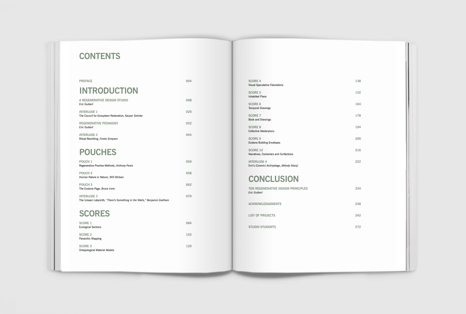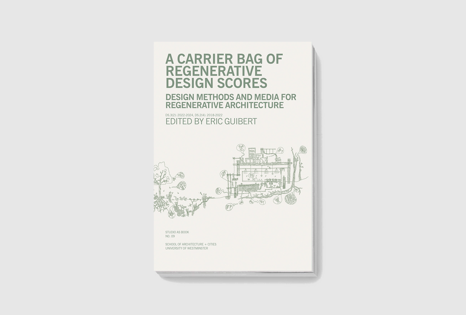 This edition of studio-as-book reflects on the regenerative pedagogy and design methods used in B.A. Design Studios DS.3(2) & DS.2(4) tutored by Eric Guibert, Anthony Powis, Michael Spooner, Bruce Irwin, and Christopher Daniel between 2018 and 2024. The studio aimed to investigate what is now called regenerative architecture and the overlap between building and landscape architecture. We have been speculating on what such a design might be, how it may be created, and the transformative pedagogies that support such learning. This research has unfolded with regenerative approaches in architecture. We hope that this first synthesis of methods will help students, teachers, and practitioners alike. The book is conceived as a CARRIER BAG holding the ten REGENERATIVE DESIGN SCORES developed in the studio and a collection of essays. We conceive “scores” as methods open for interpretation. Each score is explained and illustrated by key examples produced by students over the years.