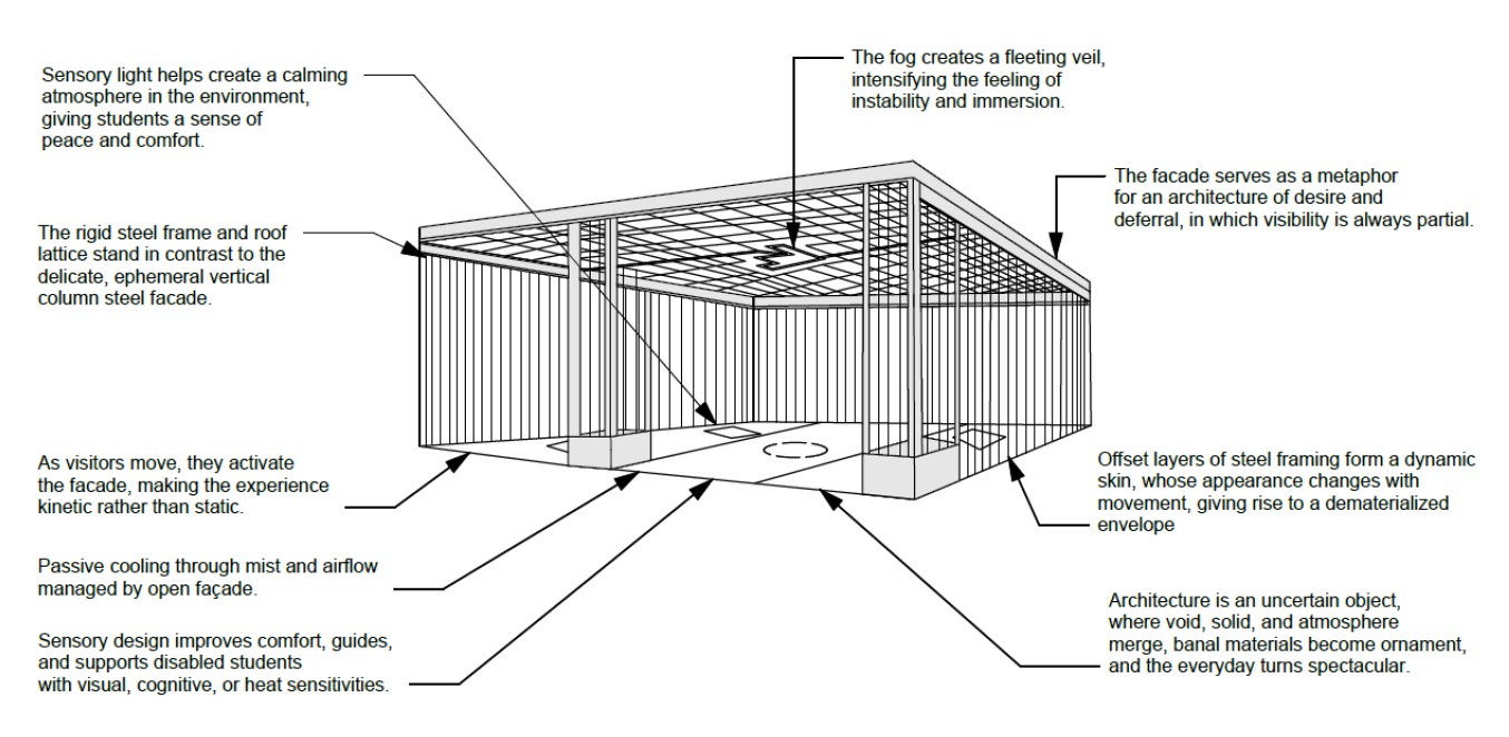 This research explores how sensory design in architecture can enhance experiences for students with disabilities. By analysing two case studies, it informs spatial strategies that integrate light, weather, and emotion into the redesign of Swiss Cottage School’s environment.