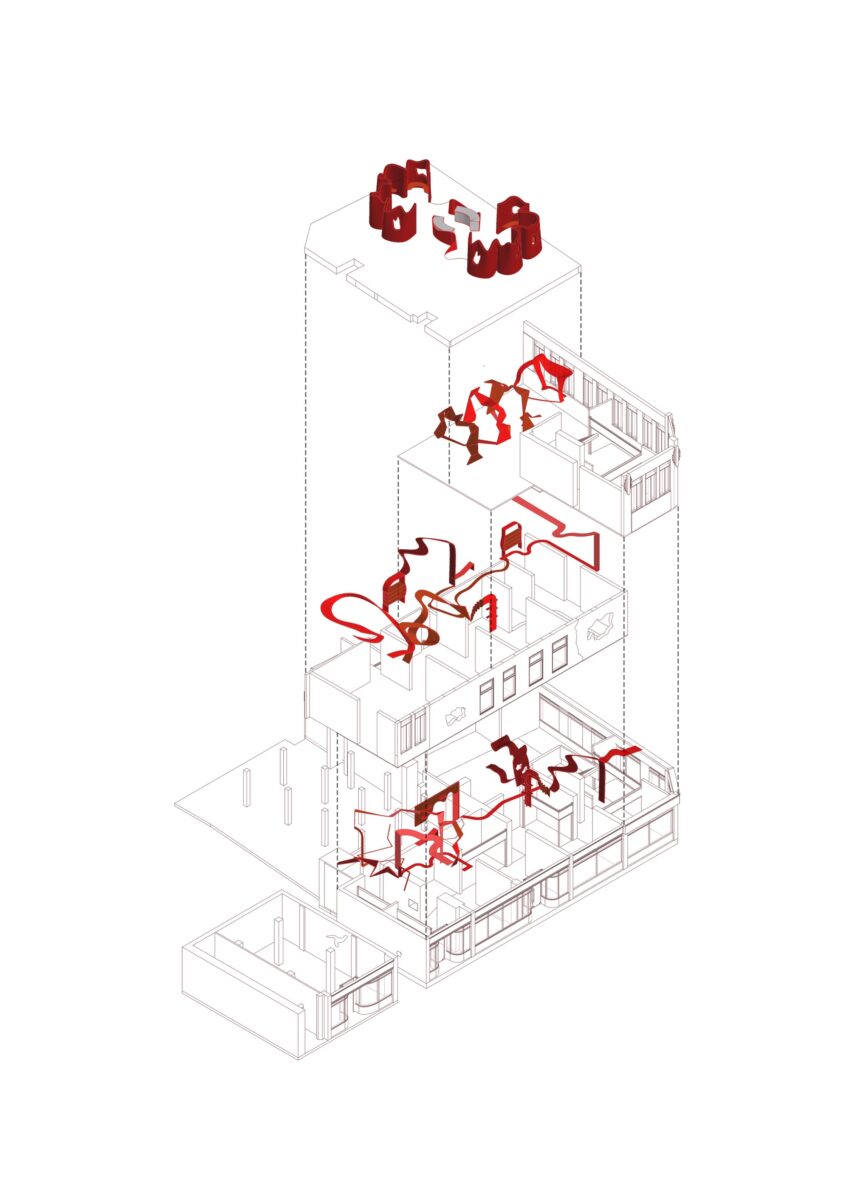 This thesis explores Alfie’s Antique Market through spatial interventions inspired by mythological threads of connection. Realised as a red thread, this guiding metaphor suggests movement, articulating rhythm within chaos, and preserving the site’s unique spatial and sensory identity.