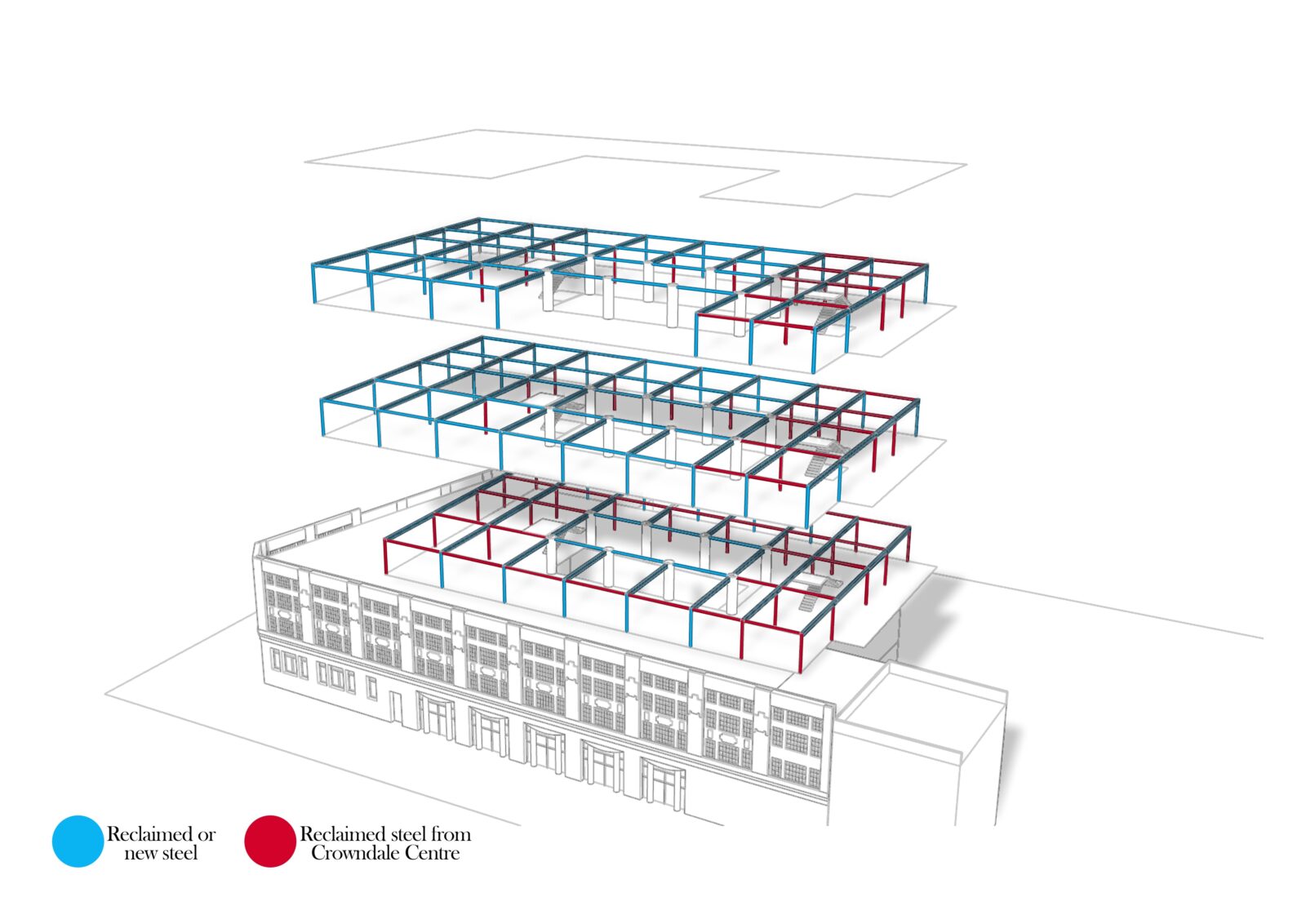 This thesis explores material circularity in architecture, focusing on reusing existing steel and aluminium from the case study building to form an extension, assessing embodied and operational carbon impacts to develop sustainable, low-carbon design strategies for future construction.