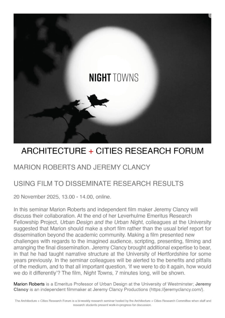 When: Thursday, 20th of November 2025, 1pm-2pm (GMT) Where: Online The next Architecture + Cities research seminar will take place Thursday 20 November, 13.00 – 14.00 online here. Marion Roberts and Jeremy Clancy will discuss their collaboration to produce a short film titled Night Towns in a seminar titled Using Film to Disseminate Research Results. All are welcome.